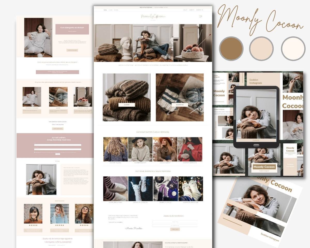 Zestaw szablonów marki linii Moonly Cocoon, a w nim: szablon sklepu, szablon landing page'a oraz 15 w pełni edytowalnych szablonów postów na Facebooka i Instagram dla Twojej firmy!